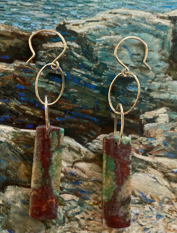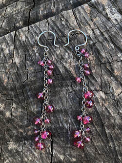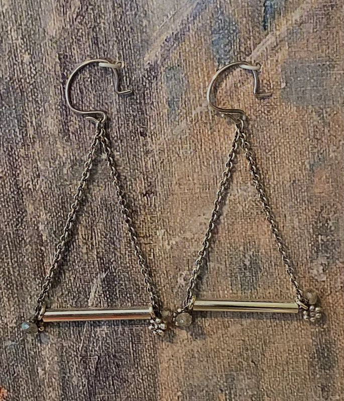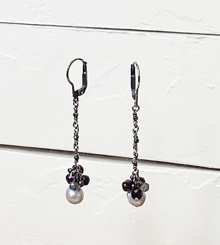 sterling silver drop earrings with gray pearl, garnet, pyrite and labradorite $125.00