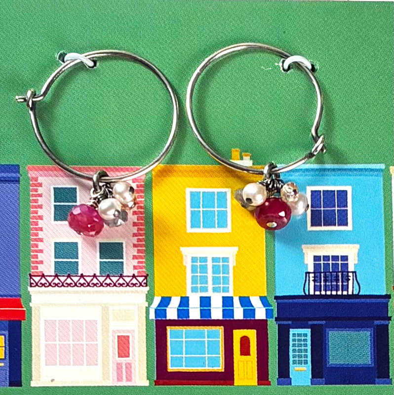 sterling silver 3/4” hoop earrings accented with ruby, pearl and quartz $70.00