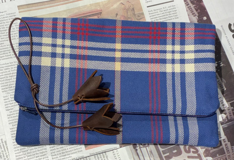 plaid zip pouch with leather bell flowers $70.00